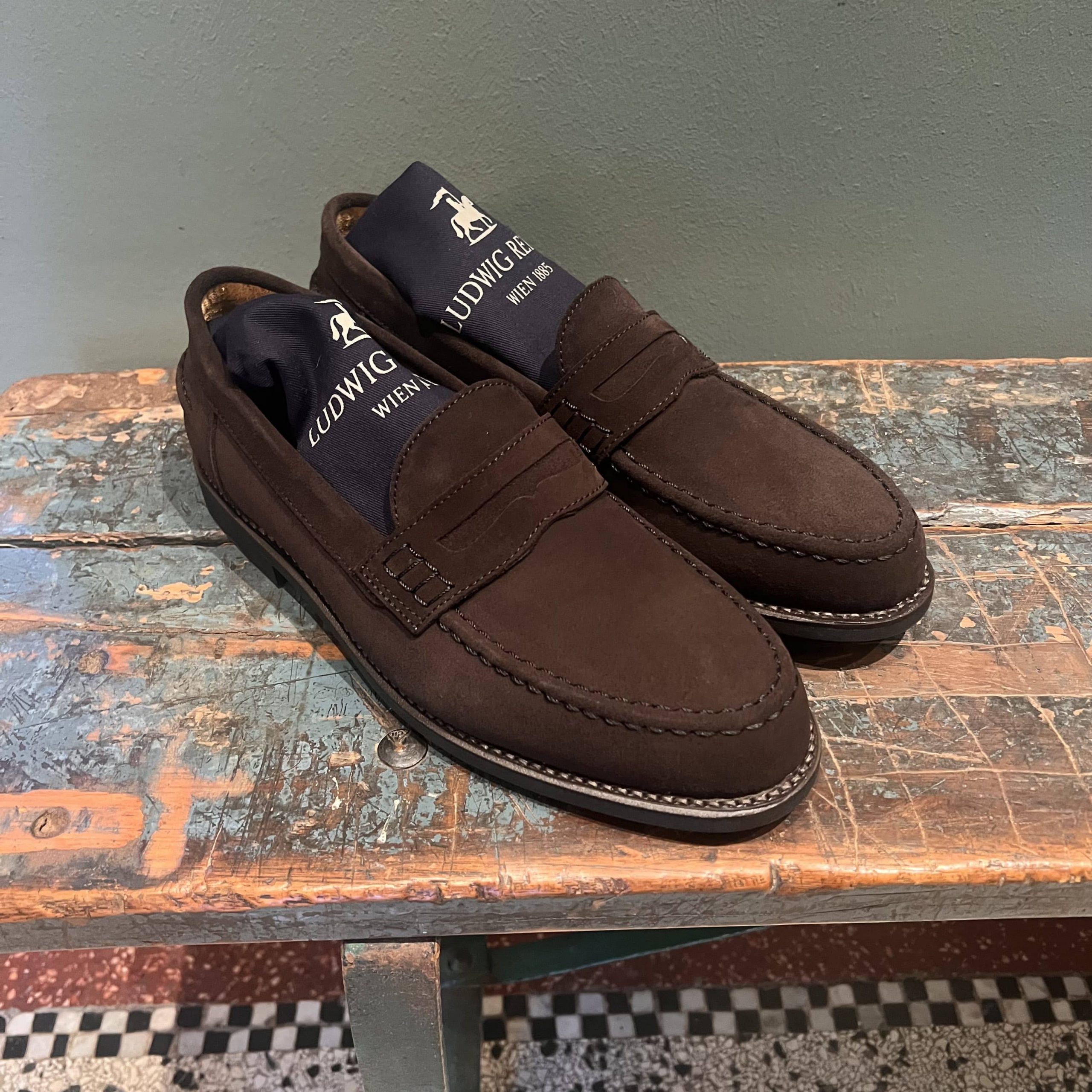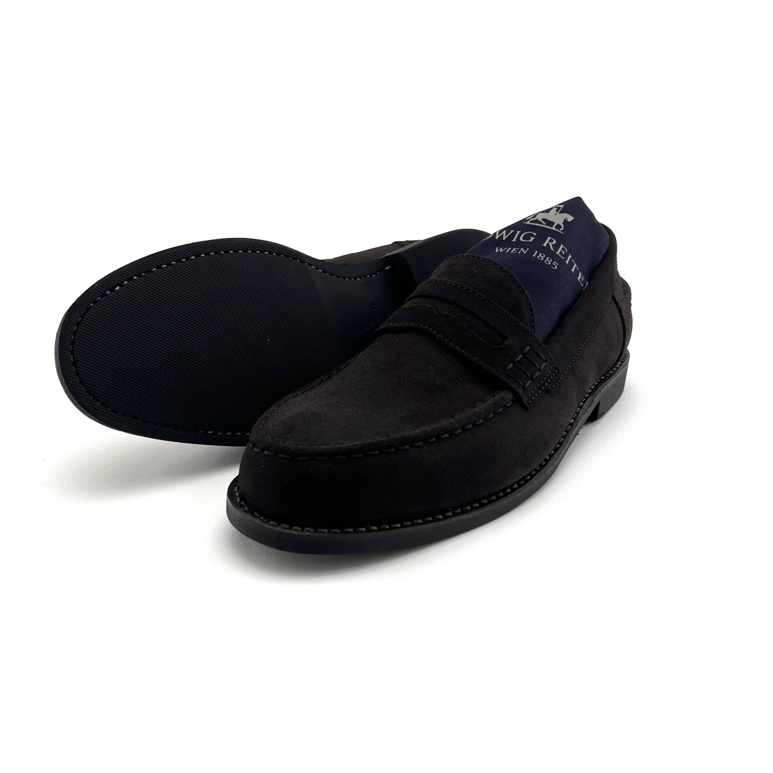 Sportlich-eleganter Loafer aus dunkelbraunem Hydrovelours mit Mokassin-Naht. Rahmengenäht auf Loaferleisten, mit Lederfutter, Lederdecksohle und Traveller-Sohle.